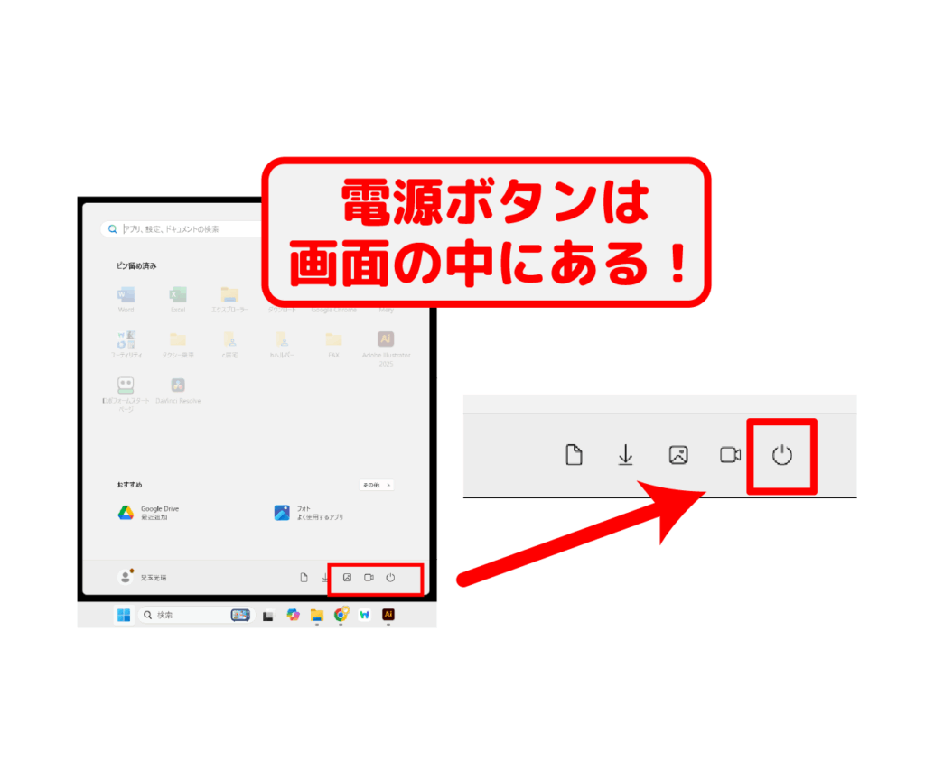 - 「Windowsボタン」→「電源ボタンをクリック」→「シャットダウン(スリープ)」
